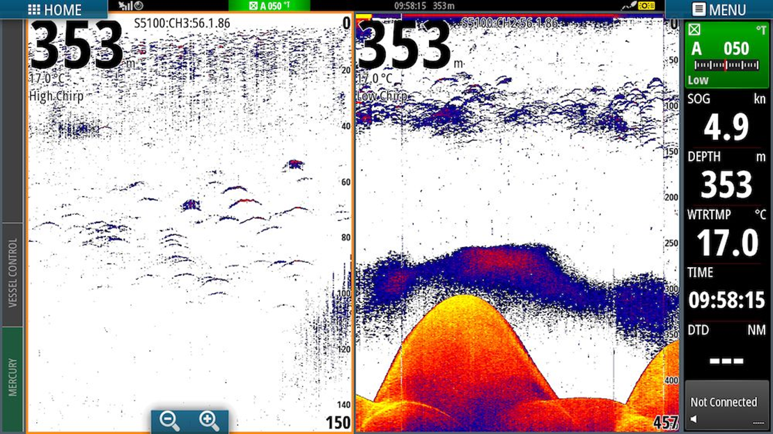 CHIRP technology uses frequency-swept pulses to provide improved target resolution and noise rejection compared to traditional single-frequency sonar. With the S5100’s advanced CHIRP technology, you’ll see clear to the bottom with no mid-water noise or clutter. The S5100 is also compatible with Airmar’s wide‐angle CHIRP transducers; these deliver enhanced coverage of the upper water column, and are a perfect fit for targeting pelagic species. Wide-angle transducers are also useful in shallow water, where traditional narrow beam angles can provide limited bottom coverage. A wider coverage area not only speeds your search, but means individual fish targets are easier to see.